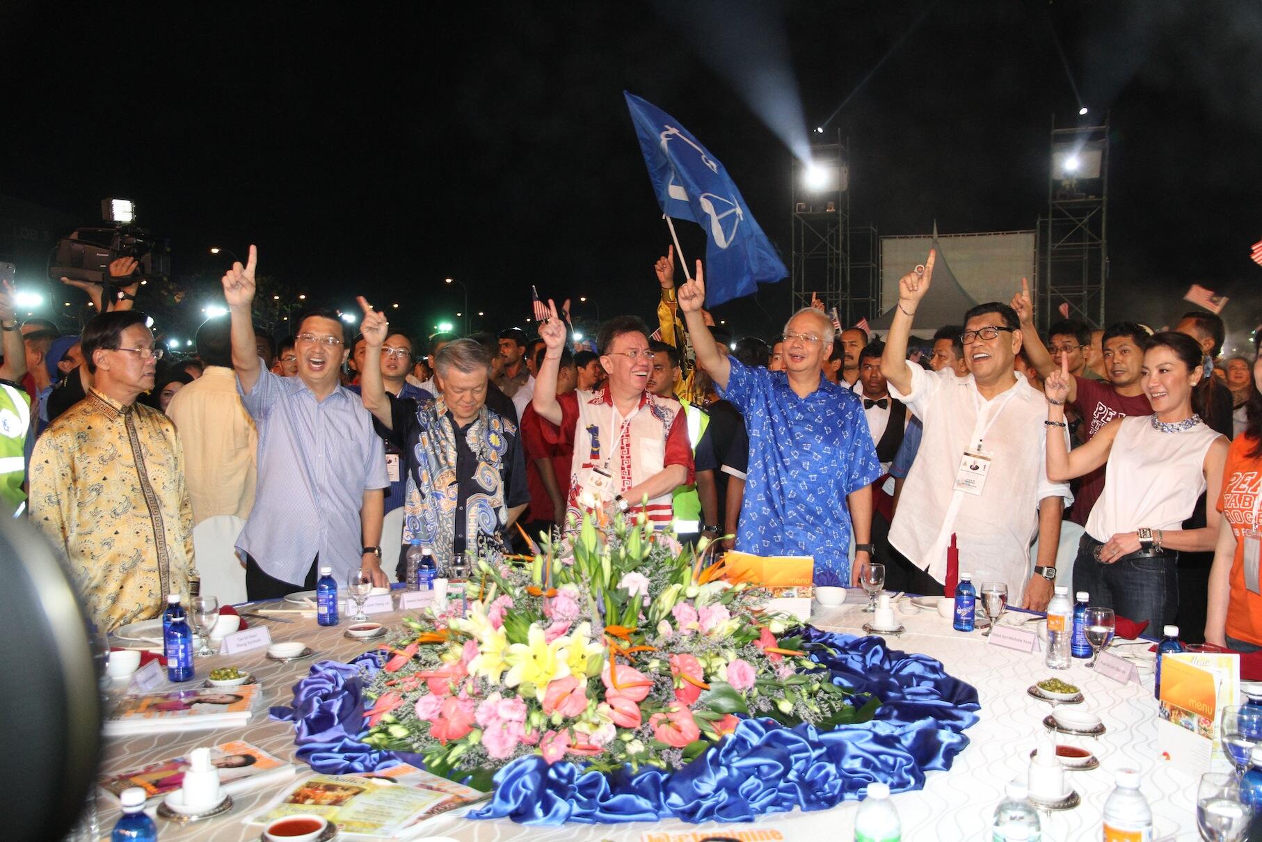 Najib acknowledging the cheers from the crowd at the dinner in Wesport.