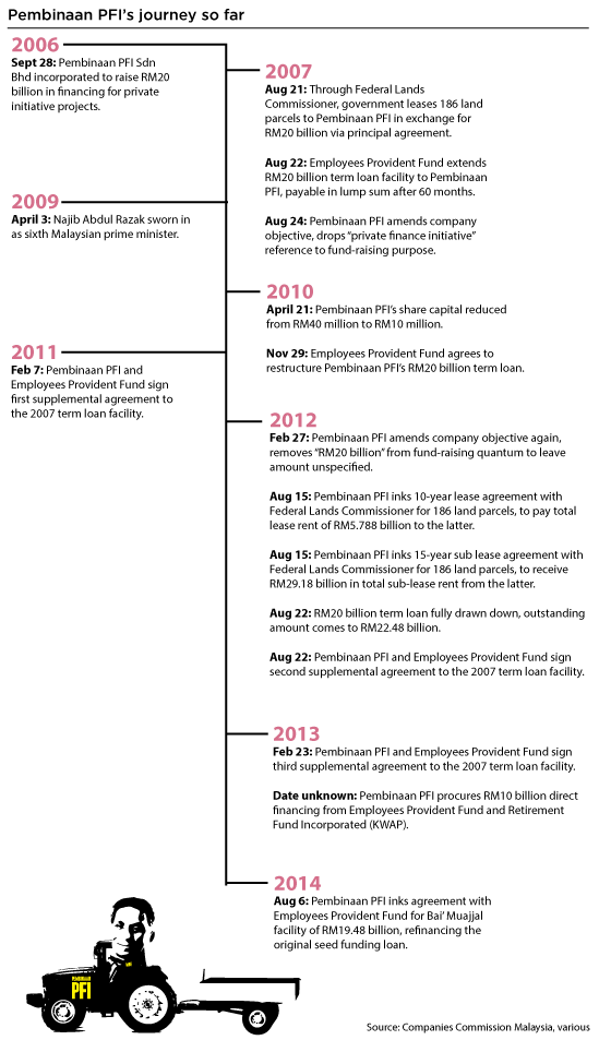 The chain of events leading to this strange transaction goes back to a term loan from the Employees Provident Fund (EPF), which extended RM20 billion to Pembinaan PFI in August 2007. This loan was to be repaid in full, inclusive of interest capitalised, 60 months later unless another date was agreed to between the parties.
