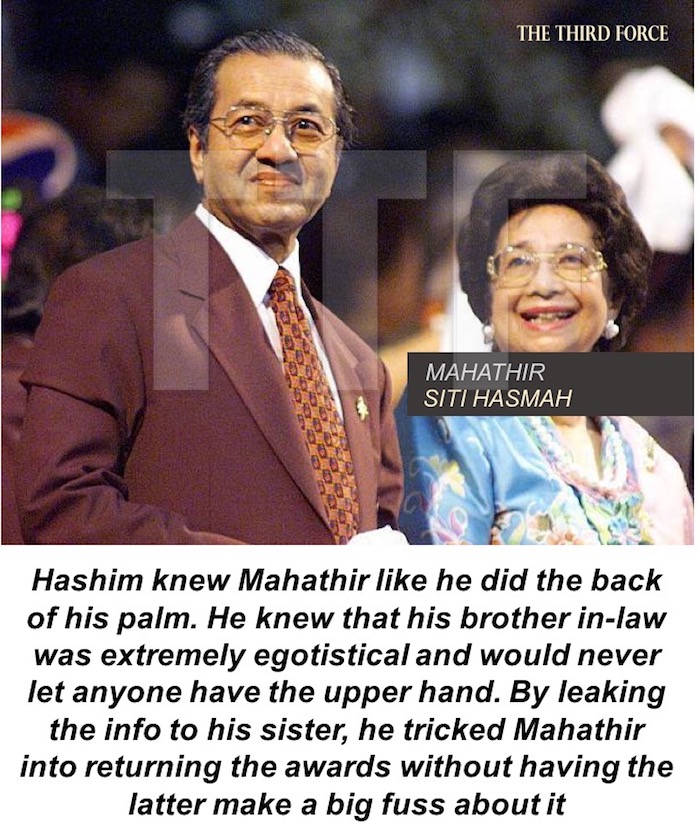 Suffice to say, the former premier returned the awards upon learning that the ruler had already planned to revoke them. The matter was leaked to Mahathir through his wife by her own brother, Tan Sri Mohamed Hashim Mohd Ali. Hashim happens to be a member of the Selangor Ruler’s Council where the ruler was scheduled to propose the revocation. The retired army general knew that by leaking the information, the former premier would immediately return the awards just to deny Sultan Sharafuddin the ‘pleasure’ of ‘embarrassing’ him in public.