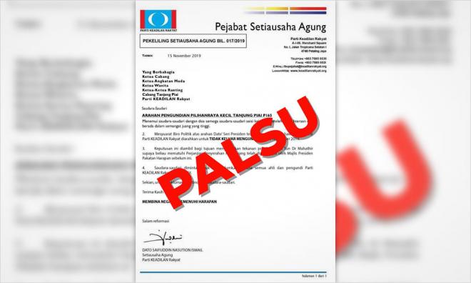 PKR communications director Fahmi Fadzil has blamed Pakatan Harapan's rivals for a fake letter ordering party members not to vote in tomorrow's Tanjung Piai by-election.