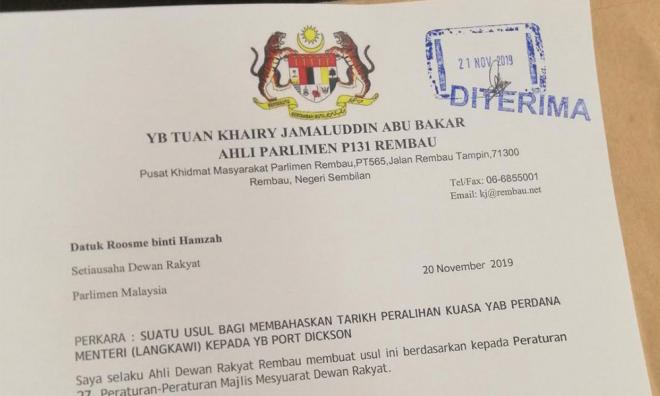 "As the representative of Rembau Dewan Rakyat, I make the motion to debate the date of transition of his honourable prime minister to his honourable Port Dickson (Anwar)," read the letter.