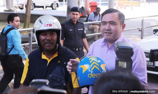 Transport Minister Anthony Loke hopped on motorcycle ride-sharing services, Dego Ride, to the Pasar Seni LRT Station today. - Mkini
