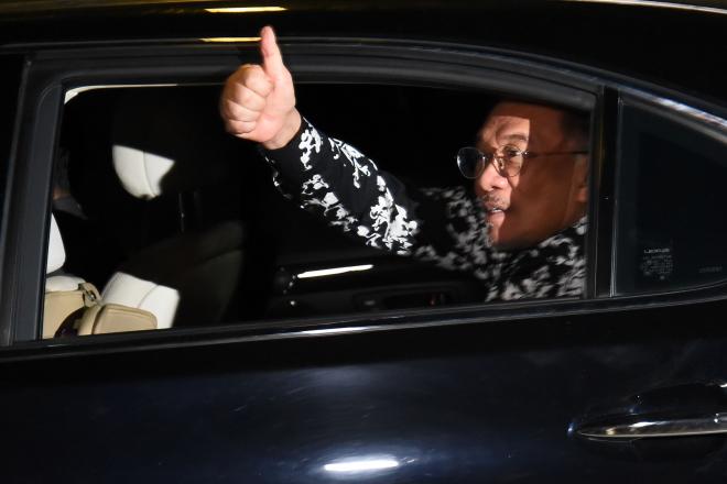 From his vehicle, PKR president Anwar Ibrahim shouts “114”, indicating the number of MPs Pakatan Harapan is now claiming to be behind them.