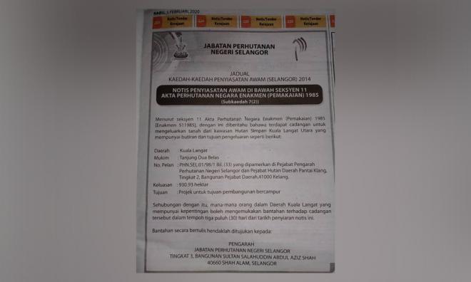 This is in accordance with the Public Inquiry (Selangor) Rules 2014, as well as National Forestry Act (Adoption) Enactment 1985, which makes the exercise (placement of notice) compulsory before a forest reserve can be degazetted.