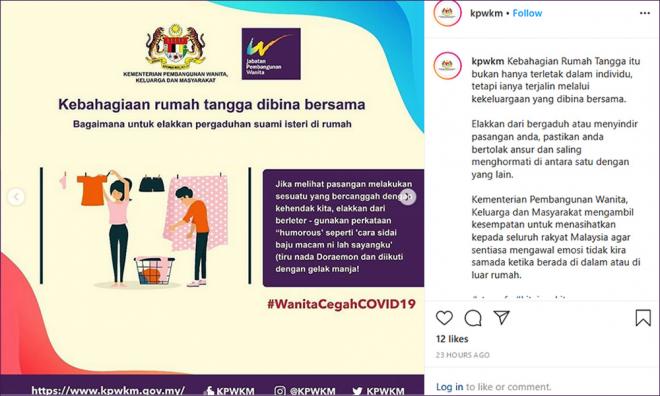 In a series of posts on Instagram yesterday, the ministry advised wives against nagging their husbands and instead recommended they emulate cartoon character Doraemon’s voice plus “giggle” to encourage their partners to help with household chores during the MCO. These posts have since been removed.