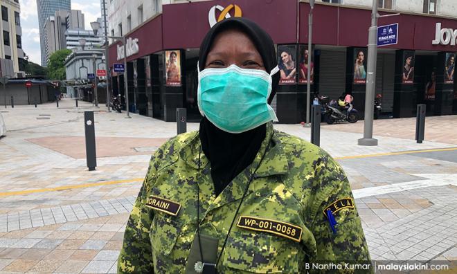 People's Volunteer Corps (Rela) member Noraini Mohd Nor (above) is among personnel on duty along Jalan Masjid India, nearby the Selangor Mansion and Malayan Mansion, two out of several areas under the enhanced MCO after a spike in positive Covid-19 cases.