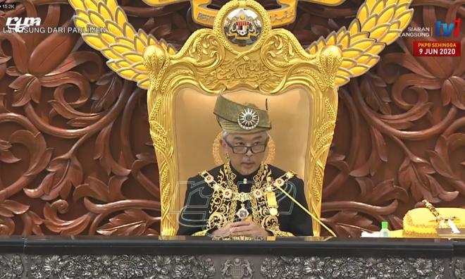 10.20am - The Yang Di-Pertuan Agong enters the House donning a face mask. His ceremonial escorts are also wearing face masks.