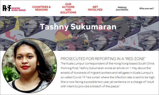 South China Morning Post reporter Tashny Sukumaran, who was quizzed by federal police for her tweets on the May 1 immigration raid at the Selangor Mansion, has been named by Reporters Without Borders (RSF) on a list of information heroes for her reporting during the Covid-19 pandemic.