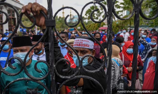 Thousands of supporters had converged there (above), many without masks and ignoring social distancing, as Najib was sentenced for abuse of power, criminal breach of trust and money laundering over RM42 million in funds belonging to state-owned SRC International Sdn Bhd.