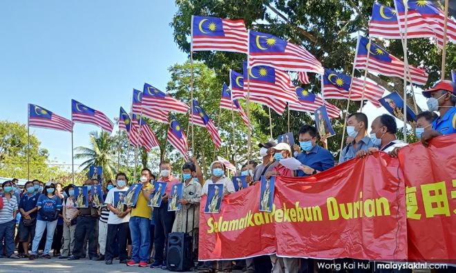 Holding photos of Yang di-Pertuan Agong Sultan Abdullah Ahmad Shah and chanting "save the durian farms", the farmers urged the king, who is also the sultan of Pahang, to intervene in the land dispute.