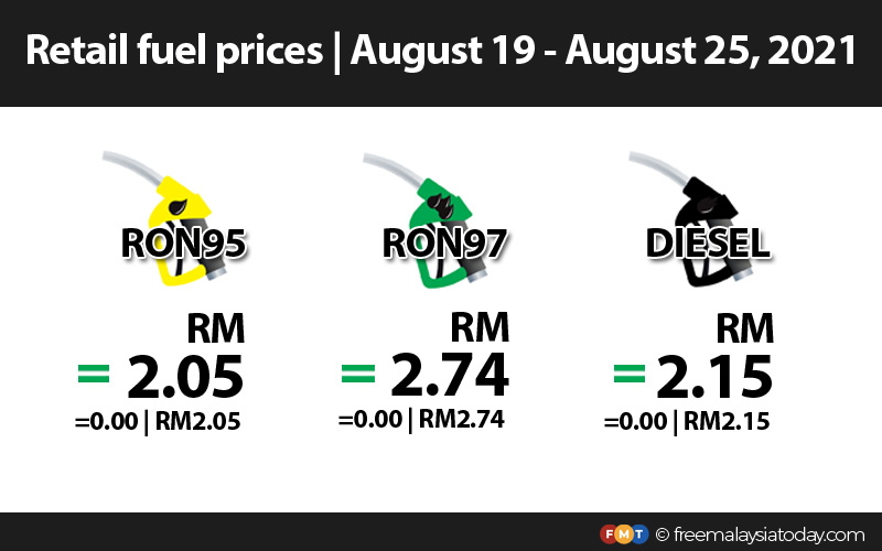 RON95 and RON97 will retail at RM2.05 and RM2.74 per litre respectively. The price of diesel, too, remains at RM2.15 a litre.
