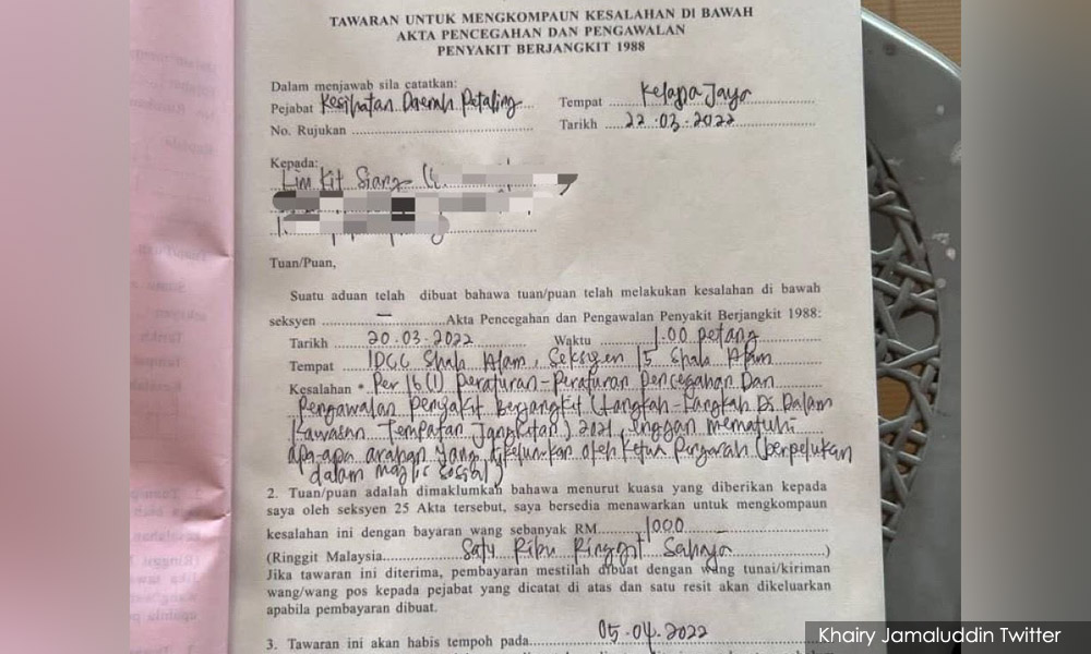 According to a photograph of the fine, which Khairy shared, Lim had violated the law by “hugging at a social function”.