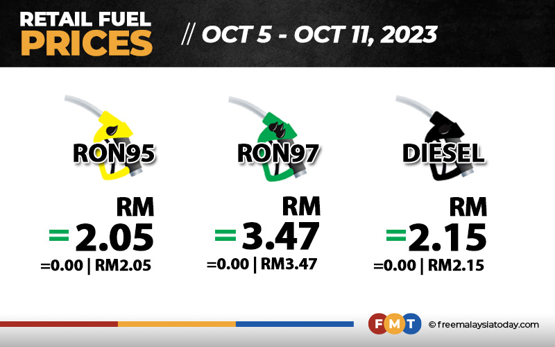 The price of RON95 is also unchanged and will continue to retail at RM2.05 per litre. The price of diesel, too, remains at RM2.15 per litre.