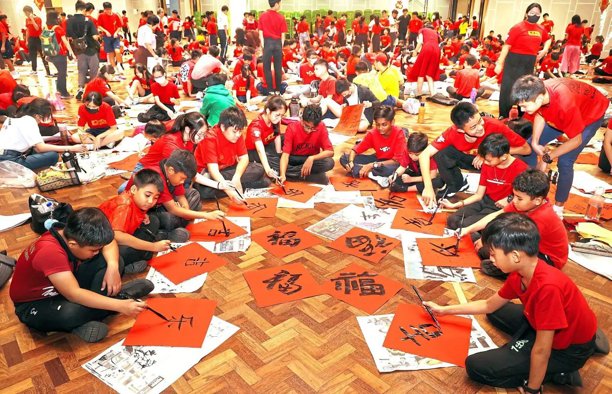 Pupils from SK La Salle Klang (center), dressed in red attire, participated in Chinese calligraphy alongside nearly 4,000 teachers and students from Hin Hua High School at the event. This marks the first time Hin Hua High School has invited teachers and students from neighboring secondary and primary schools to join their Chinese New Year calligraphy program. — KK SHAM/The Star