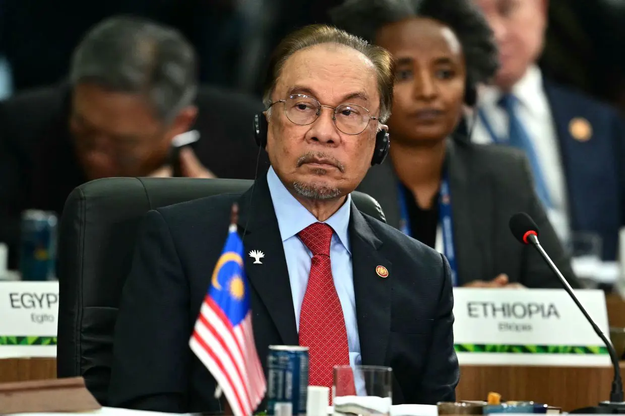 Malaysia's Prime Minister Anwar bin-Ibrahim gestures during the BRICS summit second plenary session in Rio de Janeiro, Brazil, on July 6, 2025. BRICS leaders descended on sunny Rio de Janeiro, but issued a dark warning that US President Donald Trump's "indiscriminate" import tariffs risk hurting the global economy, warning they are illegal and arbitrary, according to a final summit statement. (Photo by Pablo PORCIUNCULA / AFP)