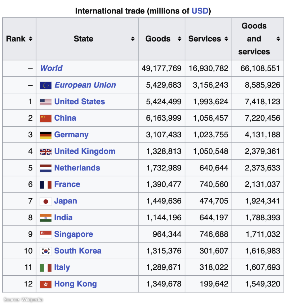 Do note that Asean (not in the table), as a bloc, comes in at number four with US$3.6 trillion in the trade of goods and US$1.1 trillion in services to give a total of US$4.7 trillion. Asean is hugely important in trading.