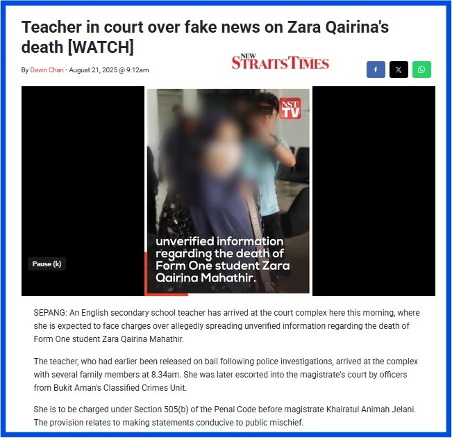 Explanation: Lawyers Hamid Ismail and Shahlan Jufri who represent Zara’s family, rubbished the story. In a media statement, they said Zara’s mother never made such a claim. The viral video was pure speculation.