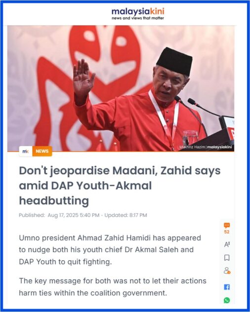 Interestingly though, Zahid who is also the Deputy Prime Minister (DPM) broke his deafening silence yesterday (Aug 17) by – to cite Malaysiakini – nudging both his youth chief Dr Akmal Saleh and DAP Youth to quit fighting.