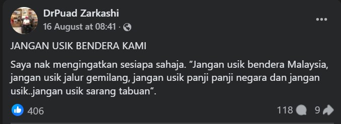 Given that vocal UMNO supreme council member Datuk Puad Zarkashi, too, had recently praised Akmal for his patriotism in defending the proper use of the Malaysian flag while a day later sternly warned that “messing with the Jalur Gemilang is tantamount to “stirring up a hornets’ nest”, Akmal has certainly caused a division within his own party.