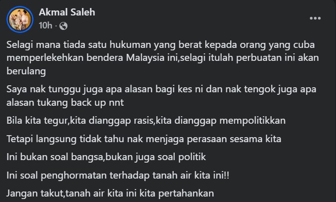 “This is not about race nor politics but about respect for our homeland! Anyway, rest assured for we (UMNO Youth) shall defend our homeland.”