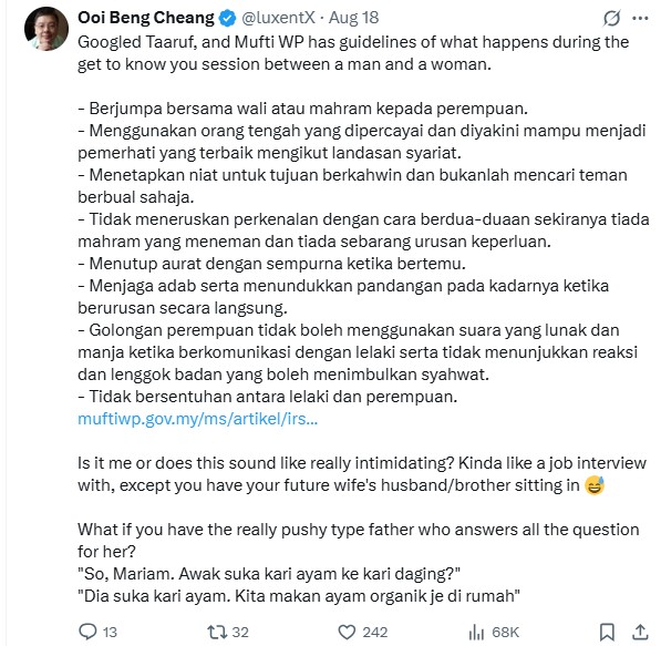 The poster helpfully shared a link to the Federal Territory Mufti’s office website which contained guidelines on get-to-know-you sessions. He did say that he found the whole concept rather intimidating – much like a job interview with family members sitting in.