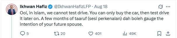 One commenter though highlighted that in Islam, “test drives” were not permitted. He believed that a few months of taaruf (get-to-know-you) sessions would be sufficient to ascertain the intentions of the future spouse.