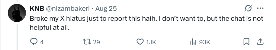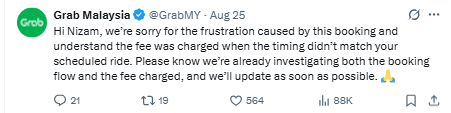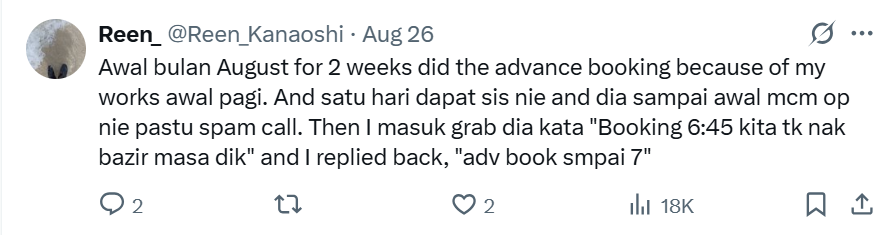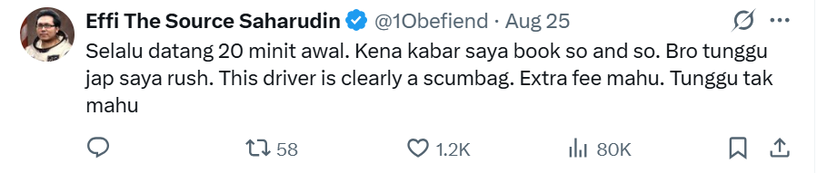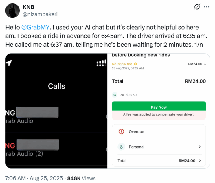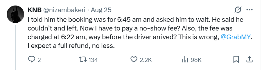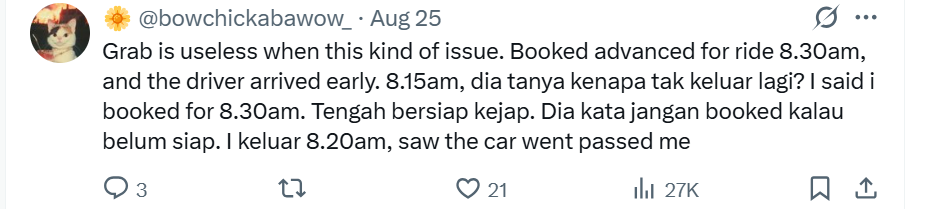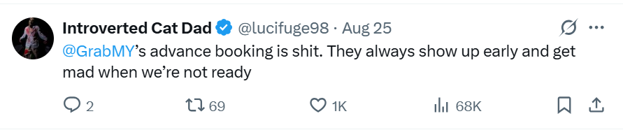 This seems to be the case when KNB (@nizambakeri) tried advanced booking an e-hailing ride. Recalling his unpleasant experience on X, the poster stated that the driver arrived early and waited the grand total of two minutes.