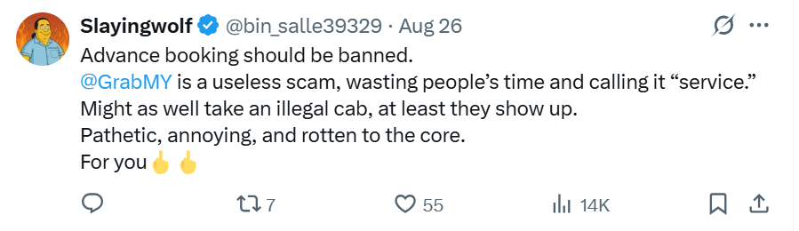 Such unpleasant experiences led one commenter to declare that advance booking features should just be banned. Such shoddy service is pushing commuters to turn to illegal cabs, which at the very least, show up. “Pathetic, annoying and rotten to the core” was this commenter’s damning verdict on GrabMY.