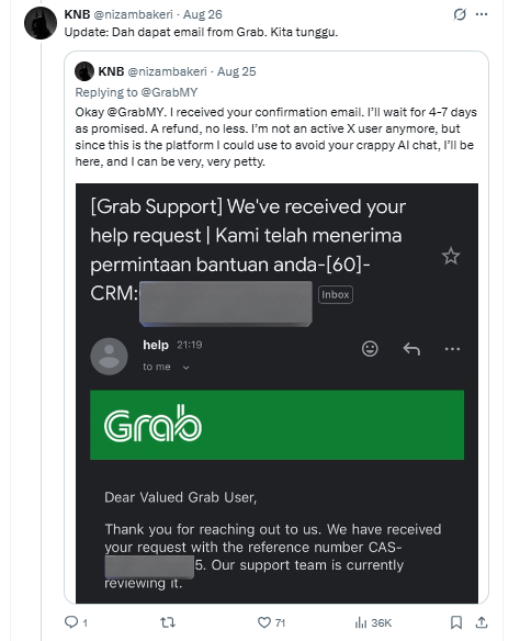 Complaining that the AI Chat on the GrabMY site was unhelpful, he was forced to bring it to wider attention on social media. He goes on to claim that the driver refused to accommodate and that a no-show fee of RM24 was charged even BEFORE the driver arrived. Nonplussed, he is demanding a full refund from GrabMY for what he obviously perceives to be highly unethical practices.