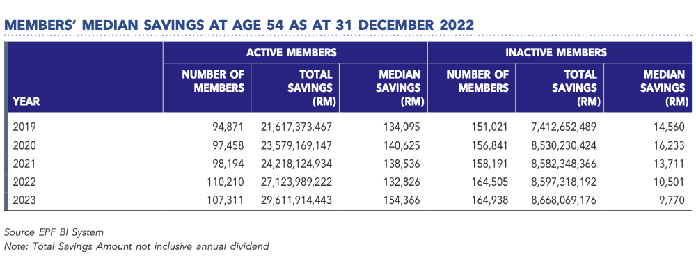 According to EPF’s annual report for 2023 (the latest), the median savings in the EPF account for active members at the age of 54 (the age before the year they are eligible to withdraw all their savings) is RM154,000, rounded off (see table).