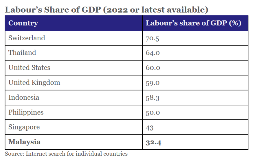 Notice, from the table, Malaysia’s labour share is the lowest. Increasing minimum wage, accompanied by productivity improvements, is essential.