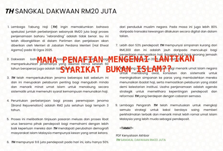 In fact, Nurul Islam had claimed the involvement of two more non-Muslim entities which he identified as Green Zebras Sdn Bhd and Centriq PR Sdn Bhd before Tabung Haji dispelled the RM20 mil allocation claim in a media statement by putting its brand rebranding cost at “RM2 mil per annum for three years”.