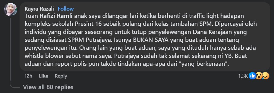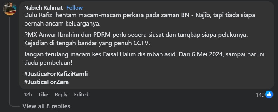 Pointing to the acid attack on footballer Faisal Hashim which on May 6 last year which has since been classified as “NFA (no further action)”, one commenter demanded that what had had happened to Rafizi’s child must not end up as a similar repeat.