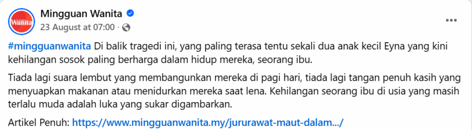Shared on the portal’s Facebook page, the post has already generated 22K Likes, 6.9K comments and 1K shares underlining that many Malaysians were moved by the story as two young children were now deprived of a mother’s love.