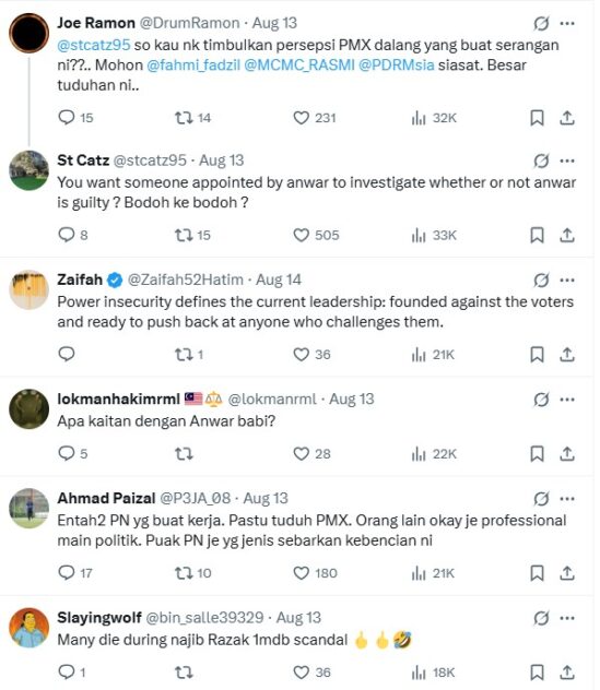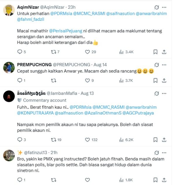 The post incurred the wrath of one commenter who forwarded it to the police, MCMC and Fahmi in addition to PMX himself and Home Minister Datuk Seri Saifuddin Nasution Ismail.