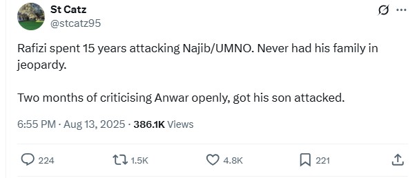 “Rafizi spent 15 years attacking Najib/UMNO. Never had his family in jeopardy,” penned St Cstz (@stcatz95). “Two months of criticising Anwar (Prime Minister Datuk Seri Anwar Ibrahim) openly, got his son attacked.”