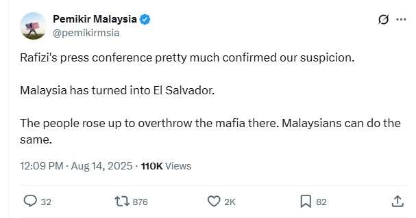 “Rafizi’s press conference pretty much confirmed our suspicion. Malaysia has turned into El Salvador,” claimed Pemikir Malaysia (@pemikirmsia). “The people rose up to overthrow the mafia there. Malaysians can do the same.