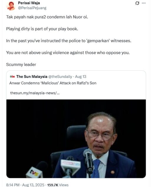 “No need to pretend to condemn, Nuor oi. Playing dirty is part of your play book,” claimed Perisai Waja (@PerisaiPejuang).