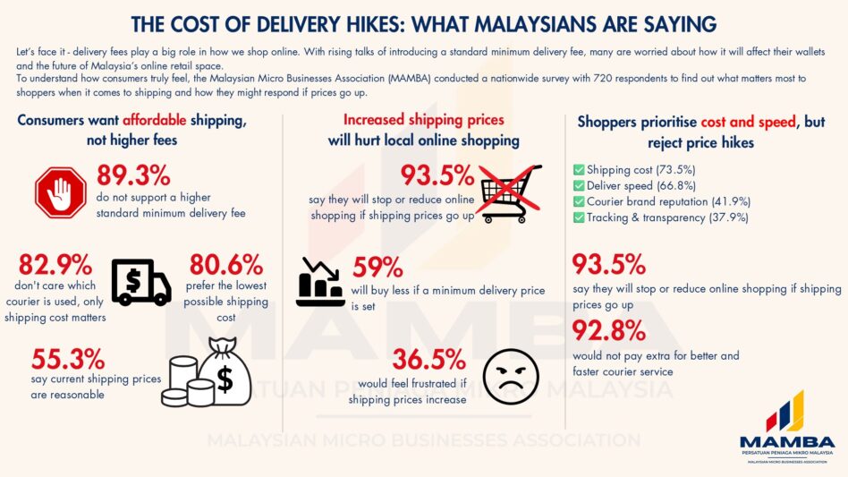 “These findings confirm what our small sellers have been saying for months that any increase in delivery charges risks pulling the brakes on Malaysia’s vibrant e-commerce sector,” said MAMBA secretary-general Alvin Low Wei Yan.