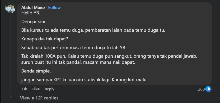 Added the former Transport Minister: “I can only guess that the Higher Education Ministry and the three universities would give this as the only ‘reasonable’ reply: Lee’s interview performance was poor, and that’s why she wasn’t admitted. “