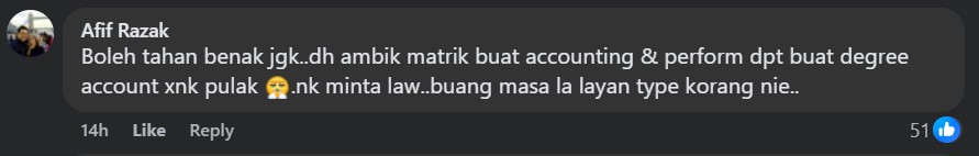Other commenters harped on the fact that Lee has ‘miscued’ in her course selection given her Matriculation subjects are not suited for a law degree which among others “emphasises on history and English Literature”.