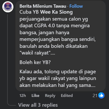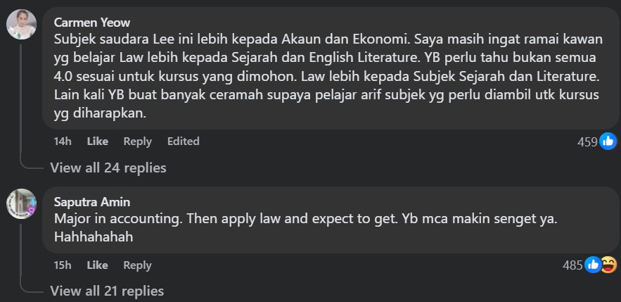 At the end of the day, some commenters teased the MCA chieftain that he should instead counselled Lee to apply to the National University of Singapore (NUS) as a scholarship “could be readily available” or to even sponsor her himself to do a law course at private universities.