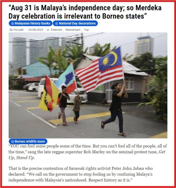 AFTER having described “Aug 31 as “Malaya’s Independence Day”, hence the recent Merdeka Day celebration is irrelevant to Borneo states, prominent Sarawak rights activist Peter John Jaban now wants Putrajaya to recognise Malaysia Day which falls on Sept 16 as the country’s “true National Day”.
