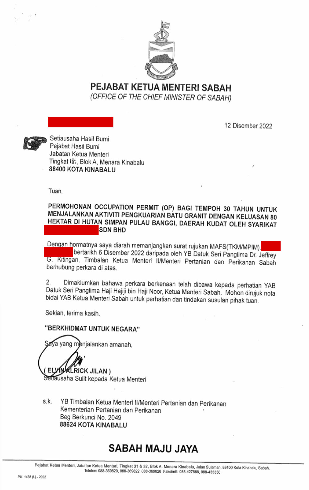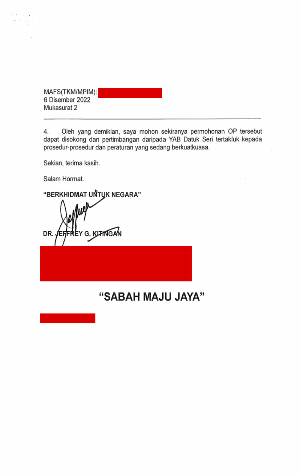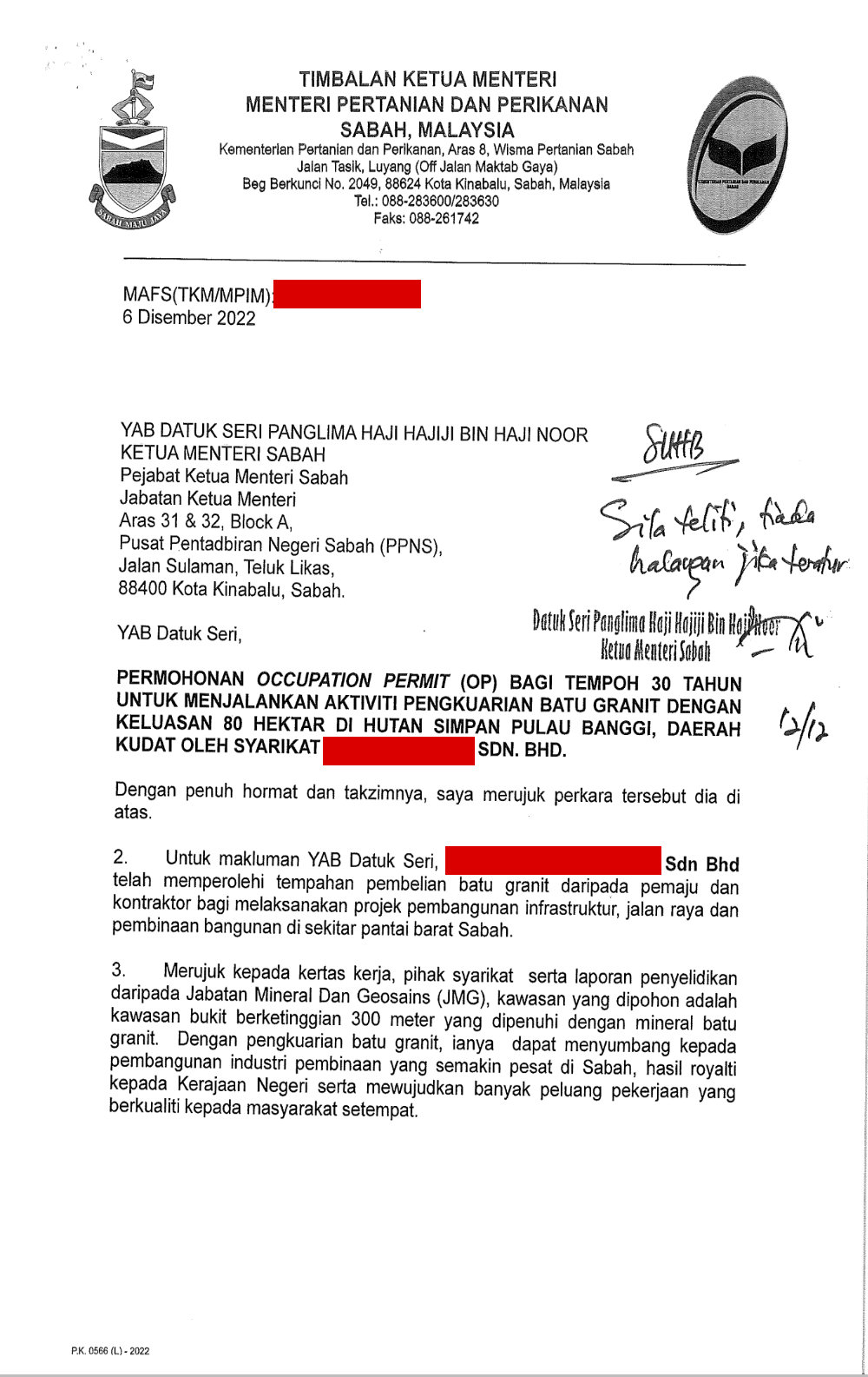 The alleged letter also contained a handwritten note and signature dated Dec 12, 2022, which read: “SUHB. Sila teliti, tiada halangan jika teratur (please review, no objection if in order).” SUHB refers to the secretary of natural resources.