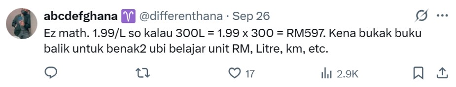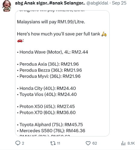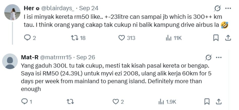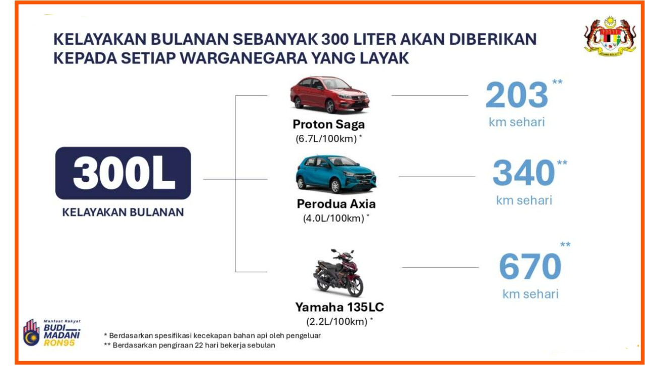 Using vehicles such as Perodua Axia and Toyota Vios to make base comparisons, the perfume trader stated that 300 litres should provide motorists with approximately 5,000 km of travel!