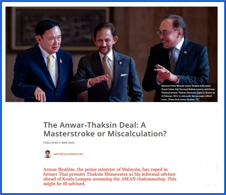 Thus, opined Singapore’s ISEAS-Yusof Ishak Institute’s Thailand Studies Programme visiting fellow and acting coordinator Napon Jatusripitak in The Anwar-Thaksin Deal: A Masterstroke or Miscalculation?:
