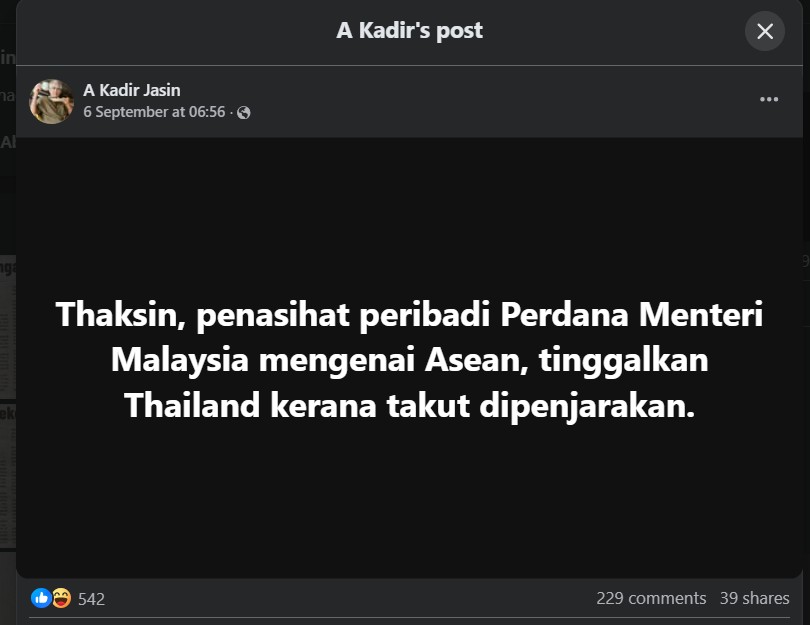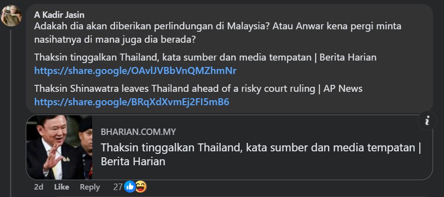 SUCH is the prevailing sentiment after veteran journalist and blogger Datuk A. Kadir Jasin posted a one-liner Facebook status update which read: “Thaksin, the Malaysian Prime Minister’s personal advisor on ASEAN, left Thailand for fear of imprisonment”.