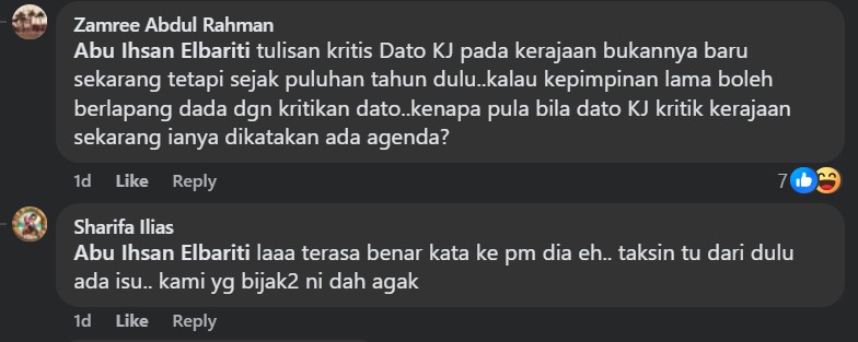 Interestingly, some commenters defended the former special media advisor to Tun Dr Mahathir Mohamad during his second premiership stint (2018-2020) when one presumably Madani fan accused Kadir of harbouring ill intention “to deliberately trying to disparage PM Datuk Seri Anwar Ibrahim”.