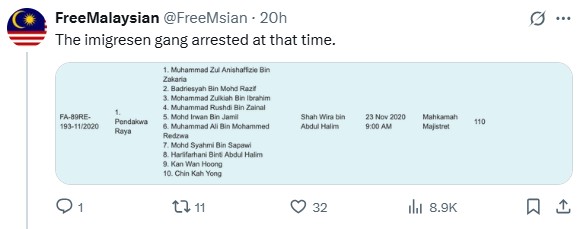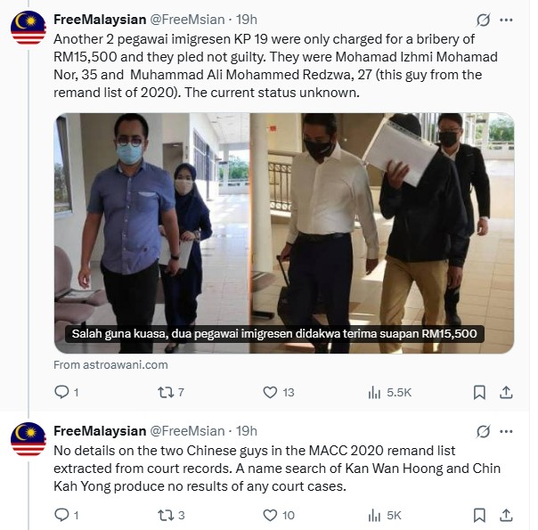 Delving further, the poster shared that another two KP 19 immigration officers were only charged for a bribery of RM15,500 to which they pleded not guilty. They were Mohamad Izhmi Mohamad Nor, 35, and Muhammad Ali Mohammed Redzwa, 27 (name in the remand list).