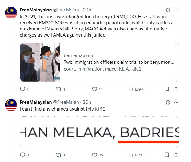 According to FreeMalaysian, the “immigration boss” was charged for a bribery of RM1,000 in 2021 while his staff who received RM310,800 was charged under penal code which only carries a maximum of two years jail alongside the MACC Act 2009 and the Anti-Money Laundering, Anti-Terrorism Financing and Proceeds of Unlawful Activities Act 2001 (AMLA).